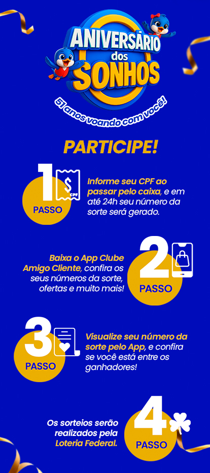 Para participar da Promoção é necessário ter maior de 18 anos, se identificar com CPF ao passar as compras, cadastrar no aplicativo Amigo Cliente e efetuar compras no valor mínimo de R$250.
